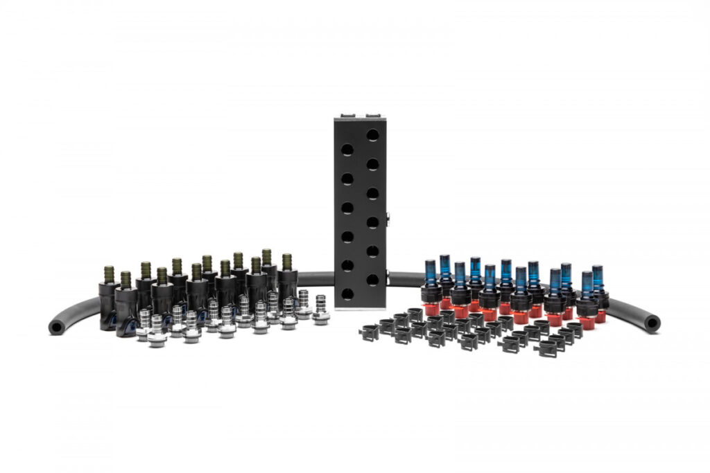 Scalable liquid distribution for complex systems. EK-Pro manifolds integrate high-performance D5 pumps and multiple outlets, ensuring balanced flow and easy loop management across multi-CPU or multi-GPU configurations.